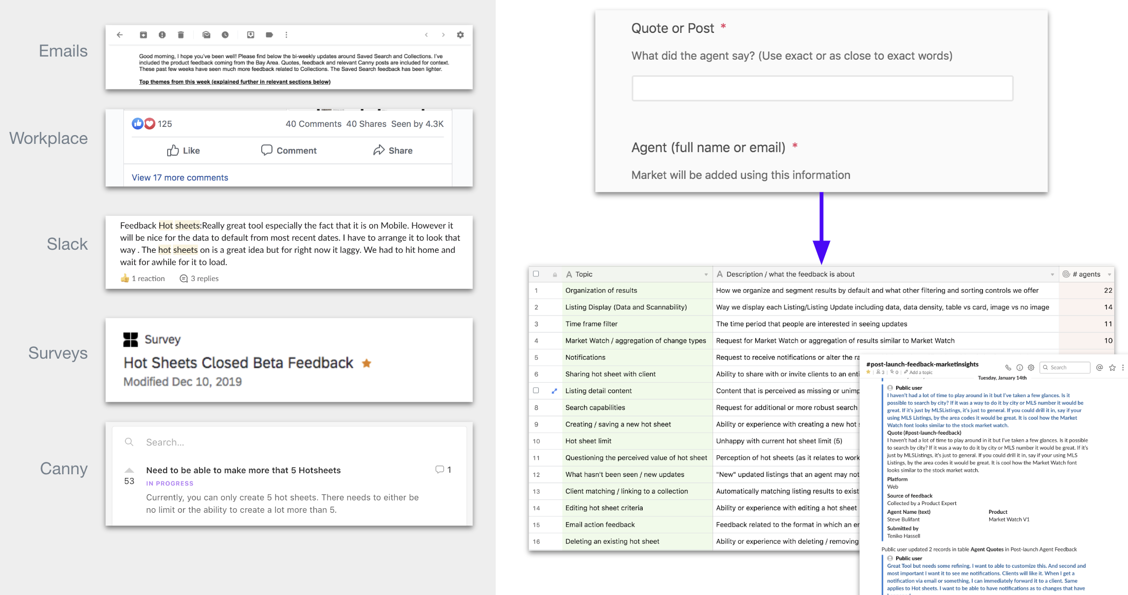 The hot sheet feature was released in alpha and beta groups with feedback surveys implemented to collect insights on the early access users; however at the time there were several additional channels from which feedback was being provided (including via email, in Compass workplace, slack, and our internal feedback tool Canny) in addition to formatted surveys. In order to collect this rich feedback, I implemented a feedback process that leveraged Airtable and allowed cross-functional team member to consolidate feedback from varying channels into one place. I then synthesized this information alongside survey data and provided the team with a cohesive representation of user feedback.