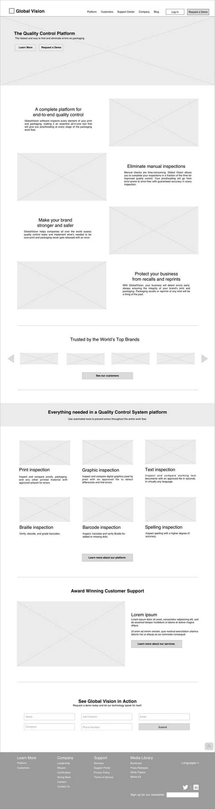 The high level goal of this project was to get a clear picture of the user(s) across the entire Global Vision product site experience and redesign the site to deliver the appropriate content and communication to increase demo requests, reduce redundancies for customer support and eliminate dead ends.